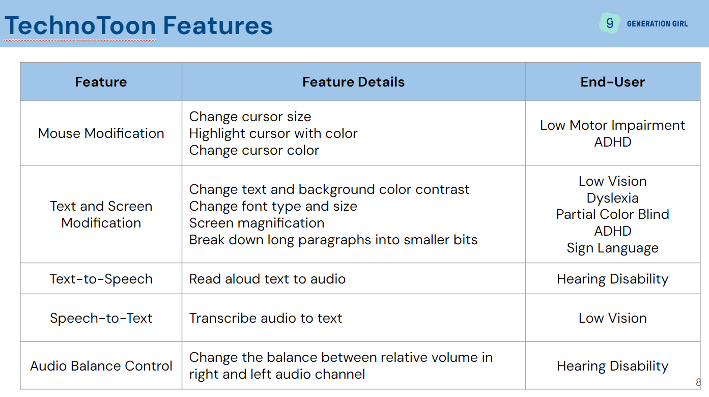 TechnoToon is a simple web-based plugin that can help people with low vision, low hearing, and motor impairment by altering the screen to adjust to their needs. Users can modify the color theme of the browser, change font styles to help them easily read the content (neutral fonts, dyslexic fonts, and sign language fonts), highlight the cursor, control the audio on right ear and left ear, and they can also use the text-to-speech and speech-to-text features. TechnoToon will also have paragraph breaker feature to help people with ADHD to focus better. You can see the image below for the detailed features and our end-users.