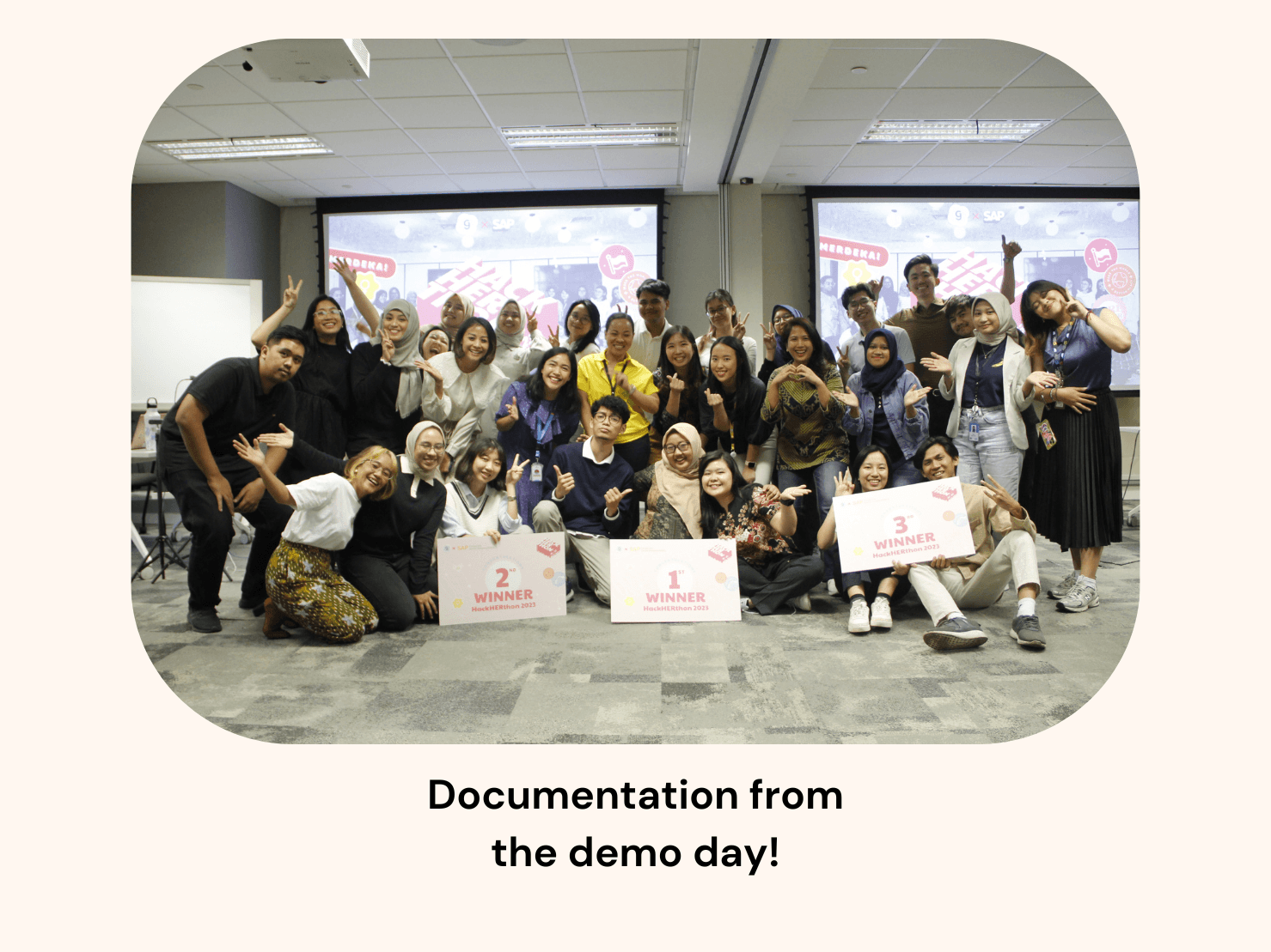 Long story short (again), we made it to the top 5 and were invited to attend the final round in person in Jakarta (specifically in World Trade Center building). Unfortunately, my other 2 members were not in Indonesia, so I was the only hope to attend the event. But oops, it was a working day/weekday, so I needed to work right๐ซฅ. I was hesitant at first to attend because I did not know the work culture in my office, like is it alright if I leave for a few hours? So with 30% bravery and after crafting a message for 30 minutes, I asked my lead if I could leave for a few hours. Then my lead replied saying that I was allowed to leave for a few hours, so I was relieved and happy and excited to attend the demo day >.< We used the rest of the days before the final round demo day to polish our presentation and consult with our mentor. We even created a list of Q&As that we thought would be asked by the judges, just to prepare ourselves because we were really determined to give our best on this competition.