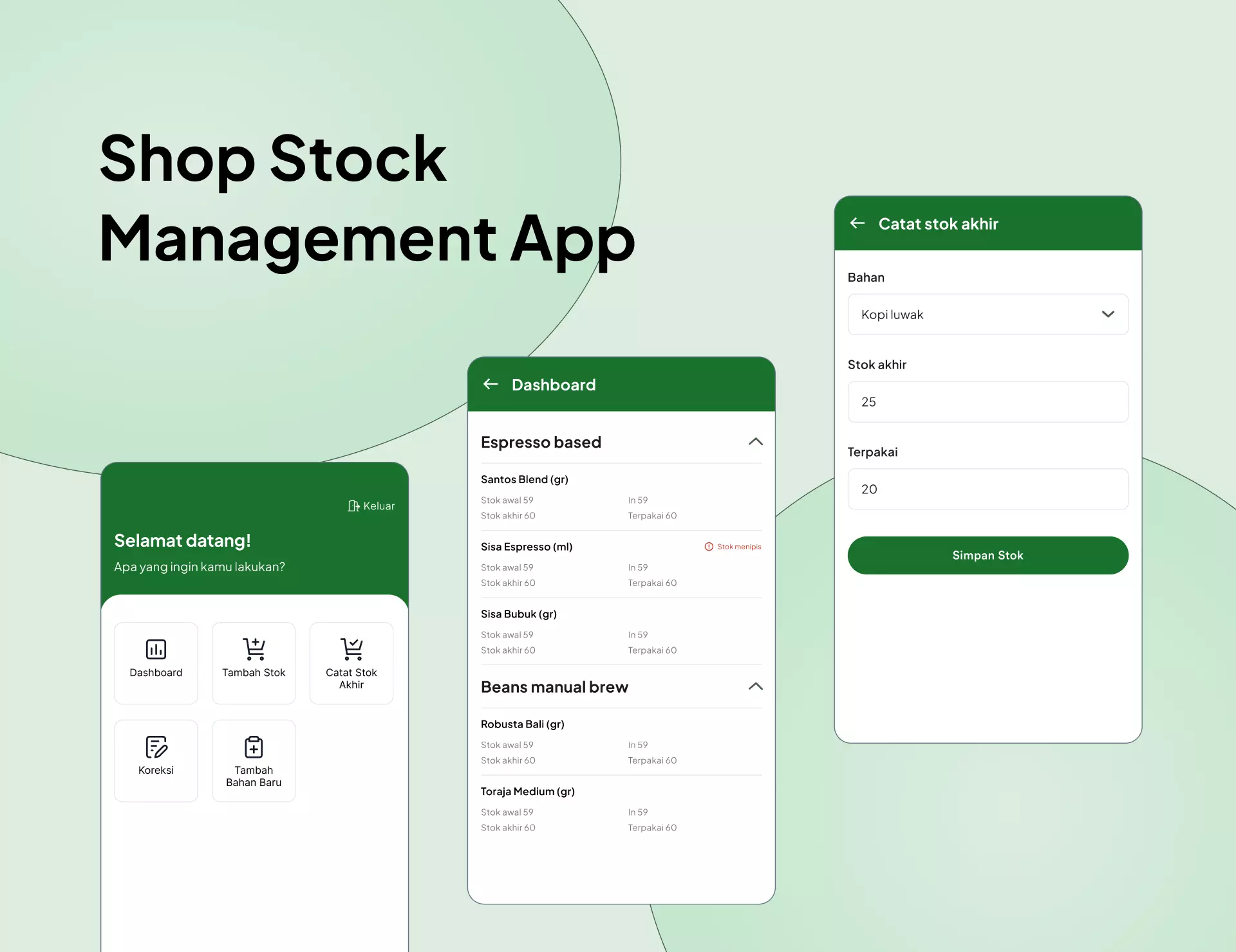 A coffee shop needs a stock management app to track the quantity of their materials. The functionalities needed are viewing the current stock for each material, adding stock, editing stock, and adding a new item.